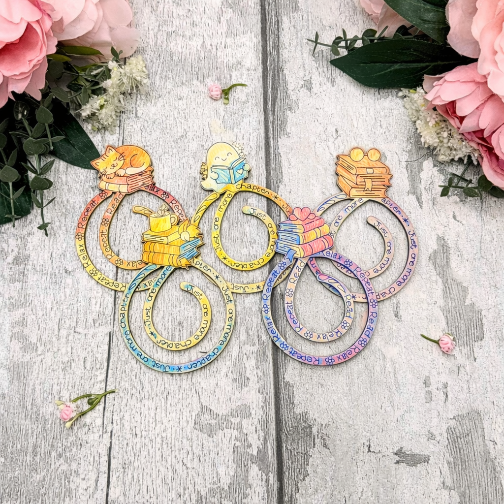 Each bookmark features an adorable reading-inspired design, from cosy stacks of books to sweet characters, with engraved wording such as “Just one more chapter” and “Read. Relax. Repeat.” Ready to be painted, personalised, and made uniquely yours.
